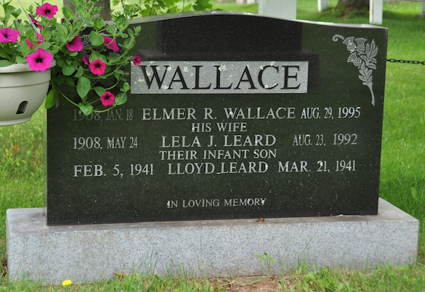 | Burial | She was buried in the United Church Cemetery, Cascumpec, Prince County, Prince Edward Island, Canada, 46.76367, -64.10800G. Inscription: WALLACE / 1908, Jan 18 Elmer R. Wallace Aug. 29, 1995 / His Wife / 1908 May 24 Lela J. Leard Aug. 23, 1992 / Their infant son / Feb. 5, 1941 Lloyd Leard Mar. 21, 1941 / In Loving MemoryBack: WALLACE.2 Tombstone, Elmer Roy Wallace, his wife Lela J. Leard, and their infant son Lloyd Leard Wallace. United Church Cemetery, Cascumpec, Prince County, Prince Edward Island, Canada. |
