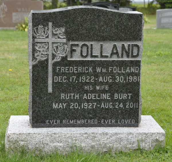 | Burial | She was buried in the Peoples Cemetery, Kensington, Prince County, Prince Edward Island, Canada, 46.44819, -63.62943G. Inscription: FOLLAND / Frederick Wm. Folland / Dec. 17, 1922 - Aug. 30, 1981 / His Wife / Ruth Adeline Burt / May 20, 1927 - Aug. 24, 2011 / Ever Remember Ever Loved.2,3 Tombstone, Frederick William Folland (1922-1981)and his wife Ruth Adeline Burt (1927-2011). The Peoples Cemetery, Kensington, Prince County, Prince Edward Island. |