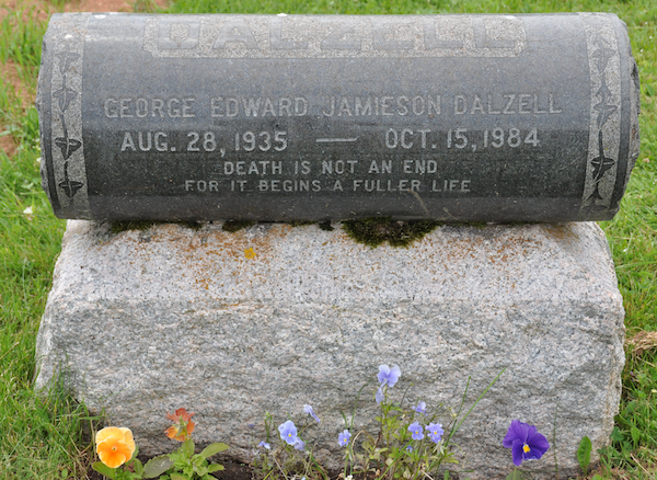 | Burial | He was buried in the Peoples Cemetery, Kensington, Prince County, Prince Edward Island, Canada, 46.44786, -63.62928G. Inscription: DALZELL / George Edward Jamieson Dalzell / Aug. 28, 1935 - Oct. 15, 1984 / Death is not an end / For it begins a fuller life. Footstone to the left: David.1 Tombstone, George Edward Jamieson Dalzell. The Peoples Cemetery, Kensington, Prince County, Prince Edward island. |
