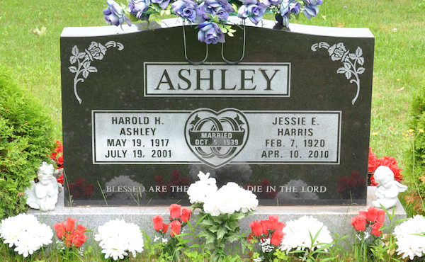| Burial | She was buried in the United Church Cemetery, Cascumpec, Prince County, Prince Edward Island, Canada, 46.76376, -64.10855G. Inscription: ASHLEY / Harold H. Ashley / May 19, 1917 / July 19, 2001 / Married / Oct. 5, 1939 / Jessie E. Harris / Feb. 7, 1920 / Apr. 10, 2010 / Blessed are the dead who died in the Lord.Back: ASHLEY.1 Tombstone, Harold Huestis Ashley and his wife Jessie E. Harris. United Church Cemetery, Cascumpec, Prince County, Prince Edward Island. |