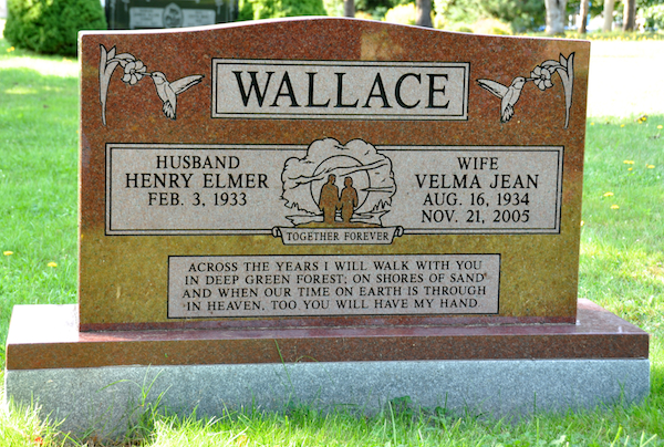 | Burial | She was buried in United & Nazarene Church Cemetery, Elmsdale, Prince County, Prince Edward Island, Canada, 46.82253, -64.13636G. Inscription: WALLACE / Husband / Henry Elmer / Feb. 3, 1933 | Together Forever | Wife / Velma Jean / Aug. 16, 1934 / Nov. 21, 2005 / Across the years I will walk with you / In deep green forest; on shores of sand / And when our time on Earth is through / In Heaven, too, you will have my hand.2 Tombstone, Henry Elmer Wallace (1933- ), his wife Velma Jean MacArthur (1934-2005). United & Zararene Cemetery, Elmsdale, Prince County, Prince Edward Island, Canada. |
