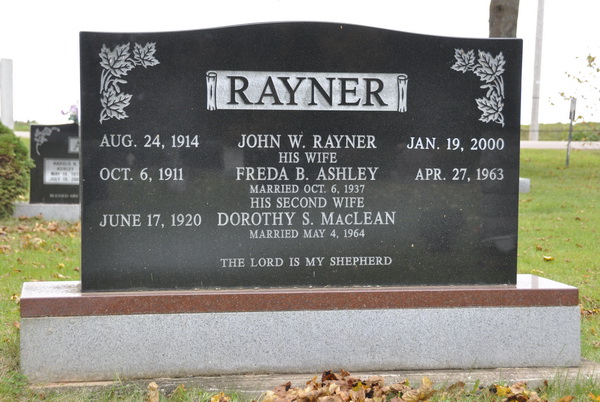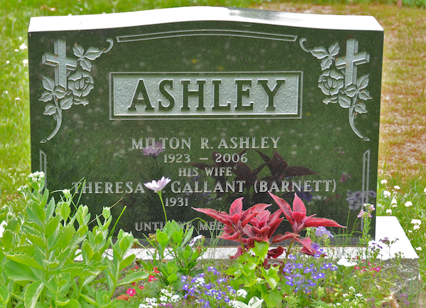 | Burial | He was buried in the United Church Cemetery, Cascumpec, Prince County, Prince Edward Island, Canada, 46.76384, -64.10789G. Inscription: ASHLEY / Milton R. Ashley / 1923 - 2006 / His Wife / Theresa B. Gallant (Barnett) / 1931 - / Until we meet again.1 Tombstone, Milton Rhodes Ashley and his second wife, Theresa B. Gallant (Barnett). United Church Cemetery, Cascumpec, Prince County, Prince Edward Island, Canada. |