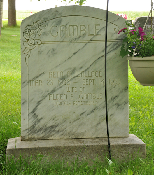 | Burial | She was buried in the United Church Cemetery, Cascumpec, Prince County, Prince Edward Island, Canada, 46.76376, -64.10820G. Inscription: GAMBLE / Reta A. Wallace / Mar. 23, 1930 - Sept. 14, 1955 / Wife of / Alden E. Gamble / Lovingly Remembered.1,2 Tombstone, Reta Annie Wallace (1930-1955). United Church Cemetery, Cascumpec, Prince County, Prince Edward Island, Canada. |
