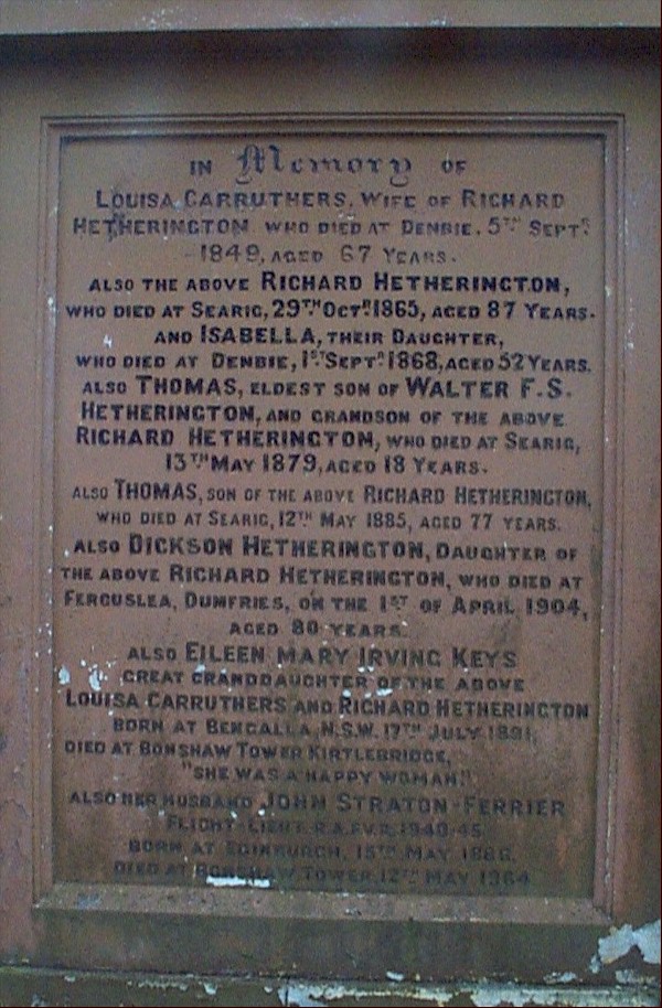 | Census | Richard Hetherington was head of the household in the census in 1841 in Dalton, Dumfriesshire, ScotlandG. included in the household were Richard's wife Louisa (Carruthers), and children Thomas, Isabella, Jessie, Richard, Dickson and Walter. Other members of the household included Mary Hastie (age 25, female servant), Jean Bell (age 20, female servant) and Sarah Bell (age 15, female servant).4 |