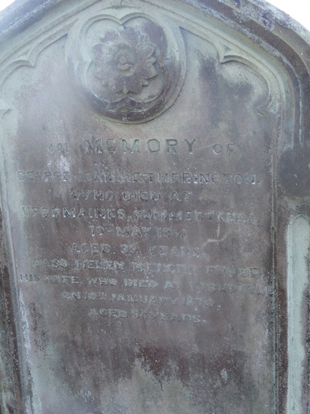 | Burial | She was buried in Ruthwell Church & Cemetery; Kirklands Loaning Rd. & B725, Ruthwell, Dumfriesshire, Scotland, 55.000208, -3.407478G. Inscription: In Memory of / George John Hetherington / Who Died at Uppermaines, Cummertrees / 19 May 1868 / Aged 39 Years / Also Helen Mercer Frood / His Wife Who Died at Kirkstyle / On 10th January 1870 / Aged 34 Years.2 Tombstone, George John Hetherington (1829-1868) and his wife Helen Frood (1837-1870). Ruthwell Churchyard, Dumfriesshire, Scotland. Photo courtesy of Joe Dougherty. |