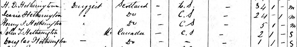 | Census | He was head of the household in the census in 1861 in Uxbridge Township, Ontario, Canada WestG. included in the household were Henry's wife Jessie (Johnston), and their three children, Henry J. (age 5), John T. (age 2), Douglas (age 1). Henry's occupation was listed as Druggist. The family religion was Church of Scotland.2 1861 Canada Census, household of Henry Duncan Hetherington, his wife Jessie (Johnston), and three children, Henry Joseph, John Todd and Douglas Murray. Uxbridge Township, Ontario. |