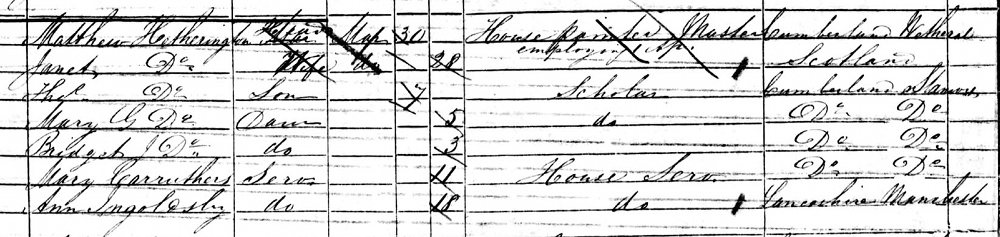 | Census | He was head of the household in the census in 1851 in Stanwix; Carlisle, Cumberland County, EnglandG. included in the household were his wife Janet (Graham), children Thomas (age 7), Mary (age 5), Bridget (age 3), Mary Carruthers (age 11, house servant) and Ann Ingoldsby (age 18, house servant). Matthew's occupation was entered as "House Painter, Master, employing 1 apprentice".2 1851 England Census, Stanwix, Cumberland County, household of Matthew Hetherington. |