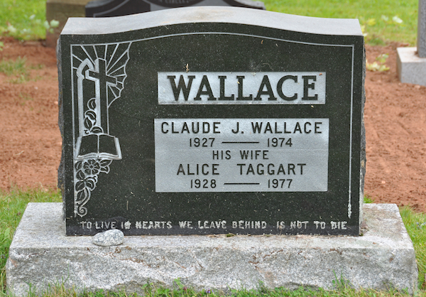 Inscription: WALLACE / Claude J. Wallace / 1927 - 1974 / His Wife / Alice Taggart / 1928 - 1977 / To Live in Hearts We Leave Behind is Not to Die.4  Tombstone, Claude J. Wallace (1927-1974), and his wife Alice Taggart (1928-1977). Sacred Heart Roman Catholic Cemetery, Alberton, Prince County, Prince Edward Island, Canada.