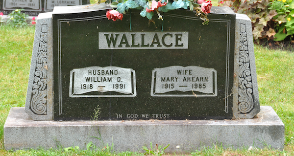 | Burial | She was buried in Sacred Heart Roman Catholic Cemetery, Alberton, Prince County, Prince Edward Island, Canada, 46.80593, -64.06386G. Inscription: WALLACE / Husband / William D. / 1918 - 1991 | Wife / Mary Ahearn / 1915 - 1985.1 Tombstone, William D. Wallace (1918-1991), and his wife Mary Ahearn (1915-1985). Sacred Heart Roman Catholic Cemetery, Alberton, Prince County, Prince Edward Island, Canada. |