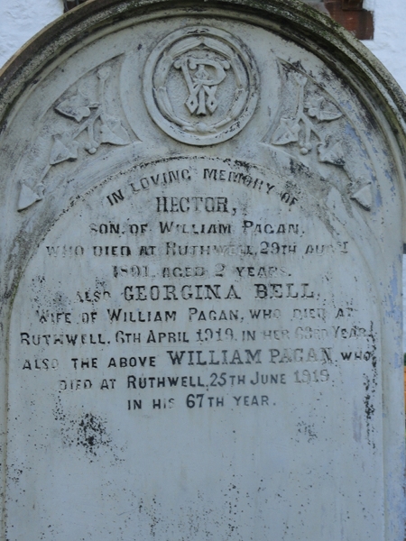 | Burial | He was buried in Ruthwell Church & Cemetery; Kirklands Loaning Rd. & B725, Ruthwell, Dumfriesshire, Scotland, 55.000208, -3.407478G. Inscription: In Loving Memory of / Hector, / Son of William Pagan / Who Died at Ruthwell 29th Augst. / 1891, Aged 2 Years / Also Georgina Bell / Wife of William Pagan, Who Died at / Ruthwell, 6th April, 1919 in Her 63rd Year. / Also the Above William Pagan, Who / Died at Ruthwell June 25th 1919 / In His 67th Year.1 Tombstone, William Pagan, his wife Georgina Bell and their son Hector. Ruthwell Churchyard, Dumfriesshire, Scotland. Photo courtesy of Joe Dougherty. |