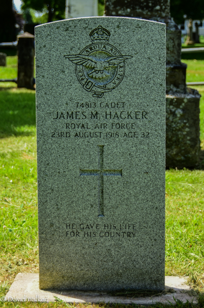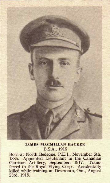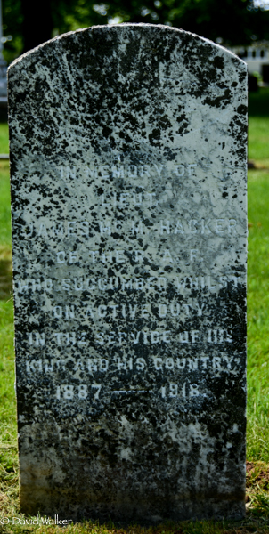 Inscription: In Memory of / Lieut. / James M. M. Hacker / of the R.A.F. / Who succumbed whilst / on active duty / in the serivice of his / King and country / 1887 - 1918Military Marker: 74813 Cadet / James M. Hacker / Royal Air Force / 23rd August 1918 Age 32 / He gave his life / for his country.3  Tombstone, James McMillan Hacker (1886-1918). Peoples Cemetery, Summerside, Prince County, Prince Edward Island, Canada.  Canadian military marker.