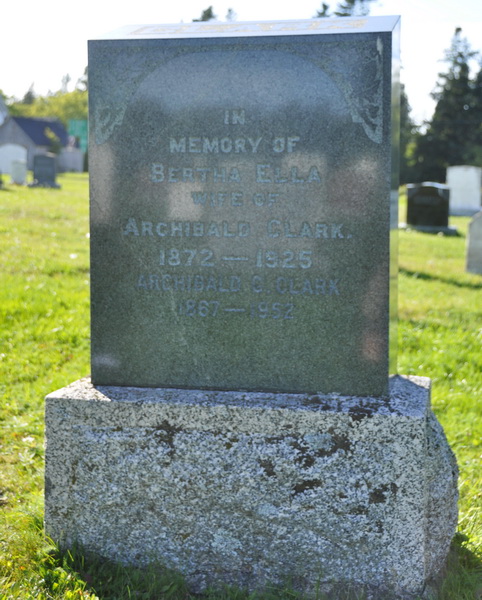 | Burial | He was buried in Nazarene United Church Cemetery, Elmsdale, Prince County, Prince Edward Island, Canada, 46.82221, -64.13650G. Inscription: In / Memory of / Bertha Ella / Wife of / Archibald Clark / 1872 - 1925 / Archibald G. Clark / 1867 - 1952.2,5 Tombstone, Archibald G. Clark (1867-1952), his wife Bertha Ella Bell (1872-1925). Nazarene/United Church Cemetery, Elmsdale, Prince County, Prince Edward Island, Canada. |