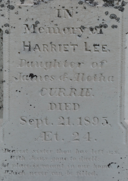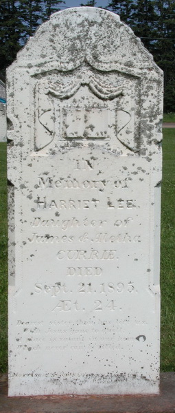 | Burial | She was buried in Nazarene United Church Cemetery, Elmsdale, Prince County, Prince Edward Island, Canada, 46.82196, -64.13669G. flat white slab tombstone. Inscription: In / Memory of / Harriet Lee / Daughter of / James & Aletha / Currie / Died / Sept. 21, 1895, / AEt. 24. / Dearest sister thou has left us, / With Jesus gone to dwell. / A place is vacant in our home / Which never can be filled.2 Flat white slab tombstone. Nazarene & United Church Cemetery, Elmsdale, Prince County, Prince Edward Island, Canada. Inscription: In / Memory of / Harriet Lee / Daughter of / James & Aletha / Currie / Died / Sept. 21, 1895, / AEt. 24. / Dearest sister thou has left us, / With Jesus gone to dwell. / A place is vacant in our home / Which never can be filled.  Front inscription detail |