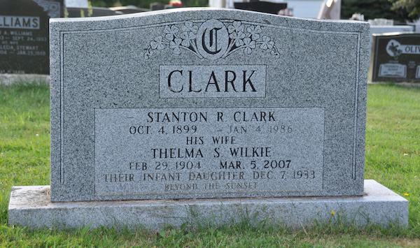 | Burial | She was buried in Nazarene & United Church Cemetery, Elmsdale, Prince County, Prince Edward Island, Canada, 46.82218, -64.13645G. Inscription: CLARK / Stanton R. Clark / Oct. 4, 1899 - Jan. 4, 1986 / His Wife / Thelma S. Wilkie / Feb. 29, 1904 - Mar. 5, 2007 / Their infant daughter Dec. 7, 1933. / Beyond the sunset.1 Tombstone, Stanton R. Clark (1898-1986), his wife Thelma Sophia Wilkie (1904-2007), their infant daughter (1933-1933). United Church Cemetery, Elmsdale, Prince County, Prince Edward Island, Canada. |