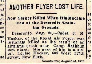 | Death | He died on 23 August 1918 in Deseronto, Ontario, CanadaG. he was instantly killed as a result of a plane crash during training near Camp Rathbun, at the Deseronto Training Grounds.1 Newspaper clipping describing the fatal crash that resulted in loss of life, Toronto Star, published 24 August 1918 |