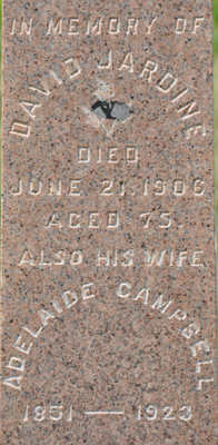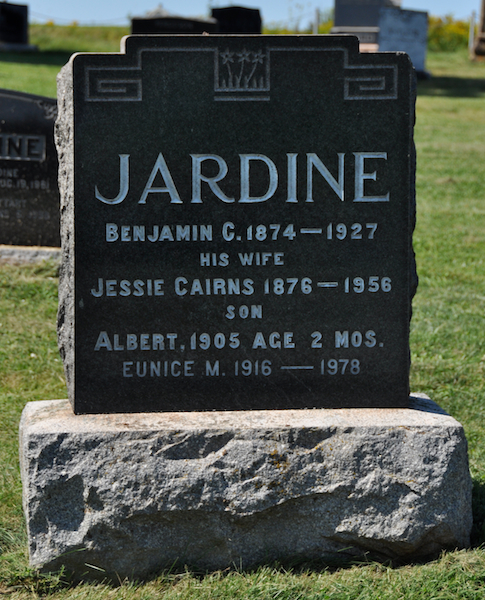 - [S4980] Cemetery Marker - Benjamin C. Jardine. Benjamin C. Jardine & Jessie Cairns, Marker Inscription; David A. Walker, 28 August 2010.