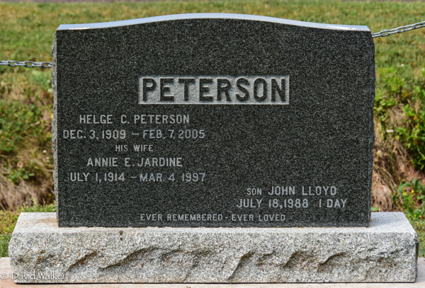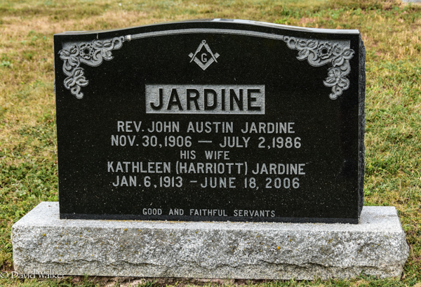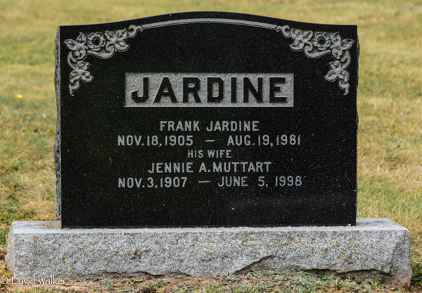 Inscription: JARDINE / Frank Jardine / Nov. 18, 1905 - Aug. 19, 1981 / His Wife / Jennie A. Muttart / Nov. 3, 1907 - June 5, 1998.3,4  Cemetery Marker: Frank Jardine (1905-1981), his wife Jennie A. Muttart (1907-1998). Presbyterian/United Cemetery, North Bedeque, Prince County, Prince Edward Island, Canada.