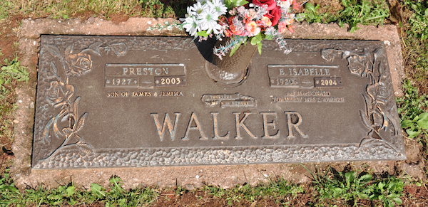 Inscription: Preston / 1927 - 2003 / Son of James & Jemima | E. Isabelle / 1920 - 2004 / Nee MacDonald / Formerly Mrs. E. Warren // Together in Memory / WALKER.1  Tombstone, Preston Walker (1927-2003), his wife E. Isabelle MacDonald (1920-2004). Floral Hills Memorial Gardens, Pleasant Valley, Queens County, Prince Edward Island, Canada.