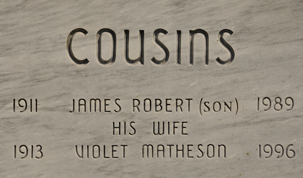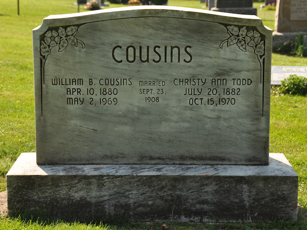 | Burial | She was buried in the People's Cemetery, Breadalbane, Queens County, Prince Edward Island, Canada, 46.35267, -63.50349G. Inscription: COUSINS / William B. Cousins / Apr. 10, 1880 / May 2, 1969 | Married / Sept. 23, 1908 | Christy Ann Todd / July 20, 1882 / Oct. 15, 1970 Back: COUSINS / 1911 James Robert (son) 1989 / His Wife / 1913 Violet Matheson 1996.1 Tombstone, William B. Cousins (1880-1969), his wife Christy Ann Todd (1882-1970), their son James Robert (1911-1989), his wife Violet Matheson (1913-1996). People's Cemetery, Breadalbane, Queens County, Prince Edward Island, Canada.  Back inscription detail. |