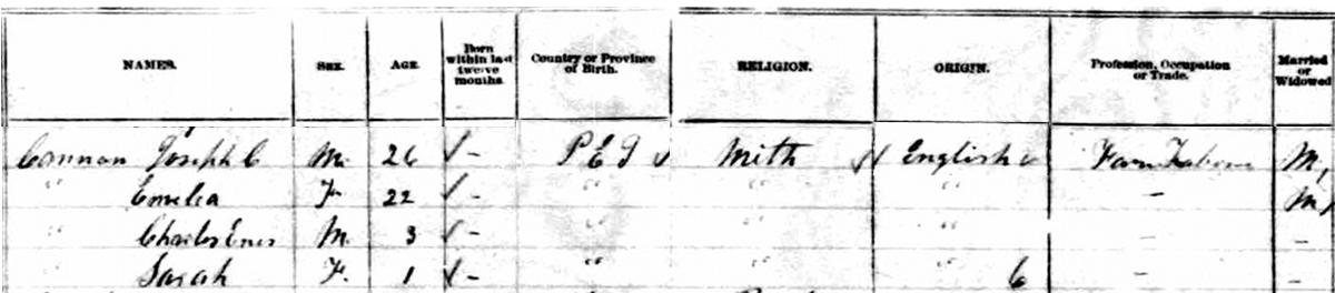 | Census | Joseph Charles Cannon was head of the household in the census in 1881 in Lot 3, Prince County, Prince Edward Island, CanadaG. included in the household with Joseph (age 26) were his wife Amelia Crossman (age 22), their children Charles Enos (age 3) and Sarah (age 1). Joseph was a farm labourer. The family religion was Methodist.2![]() 1881 Canada Census, Lot 3, Prince County, Prince Edward Island. Household of Joseph Charles Cannon, his wife Amelia Crossman, their son Charles Enos and daughter Sarah. |
