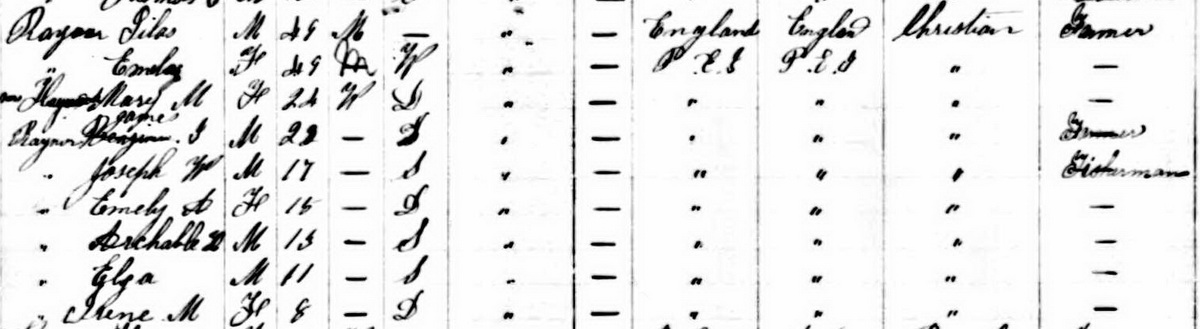 | Wife | Emily Cannon was enumerated on the census in 1881 in the household of Silas Rayner, as his wife, in Lot 3, Prince County, Prince Edward Island, CanadaG. Enumerated with Silas (age 40) were his wife, Emily Cannon (age 40) and their children, Mary (age 14), Benjamin (age 12), James (age 10), Emily (age 5), Archibald (age 3) and Elijah (age 4 months). Silas was a farmer. |