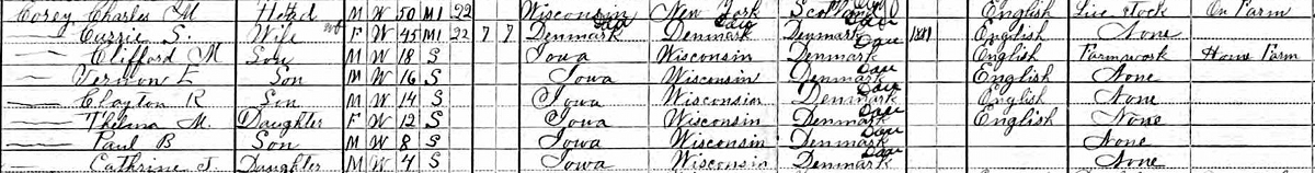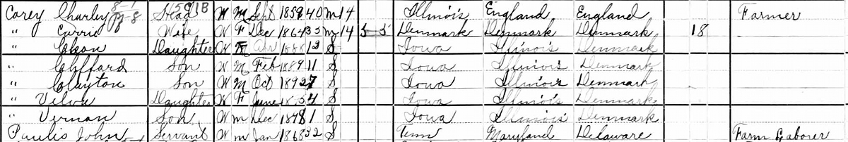 | Witness | He was enumerated on the census in 1900 in the household of Charles Myron Corey in Wesley, Kossuth County, Iowa, USAG. included in the household with Charles were his wife Carrie, sons Clifford, Vernon & Clayton, and daughters Cleon & Thelma. A servant, John Paulis, was also enumerated. Charles was a farmer.2![]() 1900 US Census, Wesley, Kossuth County, Iowa, household of Charles Corey, his wife Carrie, sons Clifford, Vernon & Clayton, and daughters Cleon & Thelma. A servant, John Paulis, was also enumerated. |