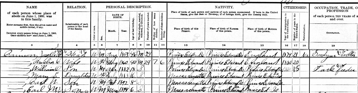 | Census | He was head of the household in the census in June 1900 in Brockton, Plymouth County, Massachusetts, USAG. included in the household with Joseph (age 46) were his wife Amelia Crossman (age 40), their children William (age 18), Mary (age 16), Carl (age 8) and Earl (age 6). [In this census he declared that he immigrated in 1879, which is incorrect as he and his young family were still in Prince Edward Island for the 1881 census.].4![]() 1900 US Census, Brockton, Plymouth County, Massachusetts. Household of Joseph Charles Cannon, his wife Amelia Crossman, their children William, Mary, Carl and Earl. |
