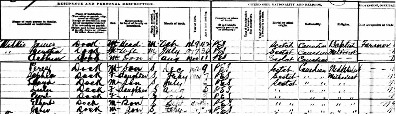 | Witness | He was enumerated on the census in 1911 in the household of James Henry Wilkie in Dock, Prince County, Prince Edward Island, CanadaG. included in the household with James (age 42) were his wife Bertha Wallace (age 34), children Arthur (age 11), Percy (age 9), Sophia (age 7), Lloyd (age 6), Lulu (age 5), Pearl (age 3), Elbert (age 9 months) and John(age 4 months). James was a farmer. James was a Baptist, other members of the family were Methodists.2![]() 1911 Canada Census, Dock, Prince County, Prince Edward Island. Household of James Wilkie, his wife Bertha (Wallace), their children Arthur, Perez, Sophia, Lloyd, Lulu, Pearl, Elbert and John. |