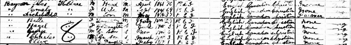 | Witness | She was enumerated on the census in 1911 in the household of Silas Rayner in Kildare, Prince County, Prince Edward Island, CanadaG. included in the household with Silas (age 70) were his wife Emily Cannon (age 69), their son Archibald (age 37), his wife Belle (age 29), their children Hazel (age 5), George (age 4), Charles (age 3) and Olive (age 1). Occupations were entered as Income" for Silas and "Farmer" for Archibald. The household religion was recorded simply as "Christian".6![]() 1911 Canada Census, Kildare, Prince County, Prince Edward Island. Household of Silas Rayner, his wife Emily Cannon, their son Archibald, his wife Belle, their children Hazel, George, Charles and Olive. |