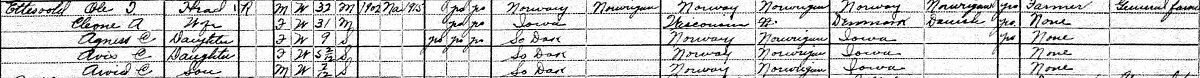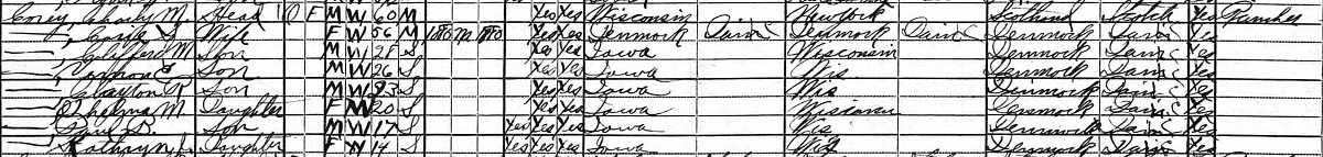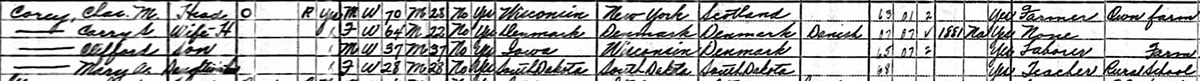 | Witness | She was enumerated on the census in 1900 in the household of Charles Myron Corey in Wesley, Kossuth County, Iowa, USAG. included in the household with Charles were his wife Carrie, sons Clifford, Vernon & Clayton, and daughters Cleon & Thelma. A servant, John Paulis, was also enumerated. Charles was a farmer.1![]() 1900 US Census, Wesley, Kossuth County, Iowa, household of Charles Corey, his wife Carrie, sons Clifford, Vernon & Clayton, and daughters Cleon & Thelma. A servant, John Paulis, was also enumerated. |