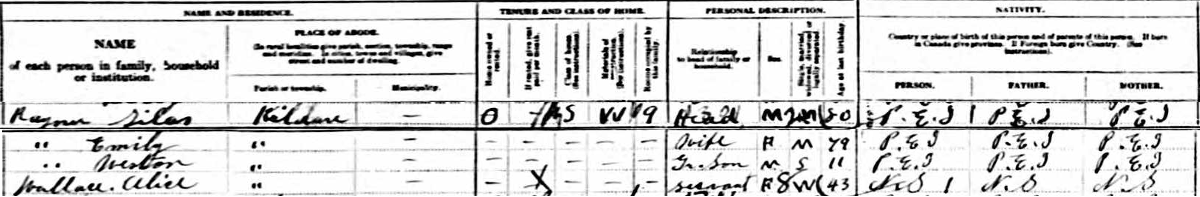 | Witness | She was enumerated on the census in 1921 in the household of Silas Rayner in Kildare, Prince County, Prince Edward Island, CanadaG. included in the household with Silas (age 80) were his wife Emily Cannon (age 79), grandson Weston Rayner (age 11) and Alice Wallace (age 43), a servant.7![]() 1921 Canada Census, Kildare, Prince County, Prince Edward Island. Household of Silas Rayner, his wife Emily Cannon, grandson Weston Rayner, and Alice Wallace, a servant.. |