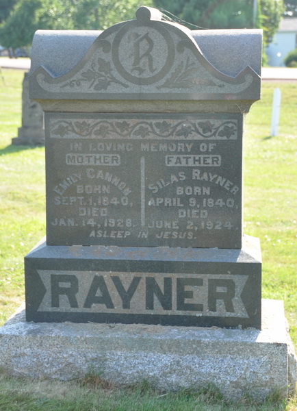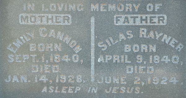 | Burial | She was buried in Greenmount Cemetery, Greenmount, Prince County, Prince Edward Island, Canada, 46.90618, -64.03522G. Inscription: In loving memory of / Mother / Emily Cannon / Born / Sept. 1, 1840, / Died / Jan. 14, 1928. | Father / Silas Rayner / Born / April 9, 1840 / Died / June 2, 1924. // Asleep in Jesus / RAYNER.2![]() Tombstone, Emily Cannon (1840-1928) & Silas Rayner (1840-1924). Greenmount Cemetery, Greenmount, Prince County, Prince Edward Island. ![]() Inscription detail. |