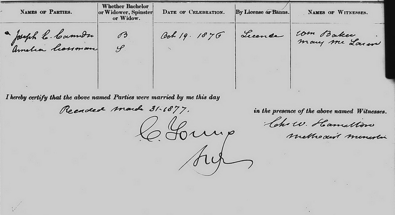 | Marriage | He married Amelia Coles Crossman daughter of Alexander Crossman and Sarah Rayner, on 19 October 1875, in Prince Edward Island, CanadaG. they were married by license, by Charles W. Hamilton. Witnesses were William Baker & Mary McLaren.5![]() Marriage Registration, Joseph Charles Cannon and Amelia C. Crossman, 19 October 1875. |
