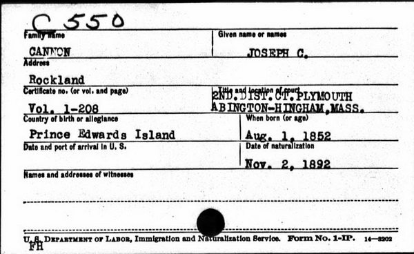 | Natlzation | He was naturalized on 2 November 1892 in 2nd District Court, Abington-Hingham, Plymouth County, Massachusetts, USAG.3![]() US Naturalization Record, Joseph Charles Cannon. 2 November 1892. |