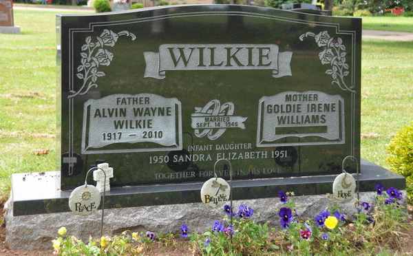 | Burial | He was buried in Church of the Nazarene Cemetery, Elmsdale, Prince County, Prince Edward Island, Canada, 46.82237, -64.13637G. Inscription: WILKIE / Father / Alvin Wayne / Wilkie / 1917 - 2010 | Married Sept. 14, 1946 | Mother / Goldie Irene / Williams / // Infant daughter / 1950 Sandra Elizabeth 1951 / Together forever in His heavenBack: WILKIE / Alvin W. Wilkie / Pte. / RCASC / 1942 - 1945 / Lest we forget.4,6 Tombstone, Alvin Wayne Wilkie (1917-2010), his wife Goldie Irene Williams ( ), daughter Sandra Elizabeth (1950-1951). Church of the Nazarene Cemetery, Elmsdale, Prince Coiunty, Prince Edward Island, Canada. |