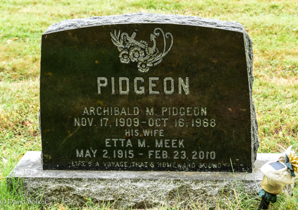 - [S12657] Cemetery Marker, St. Thomas Anglican Cemetery, Springbrook, Queens County, Prince Edward Island, Canada. Archibald M. Pidgeon & Etta M. Meek, photograph & inscription; read by David A. Walker, 18 September 2017.