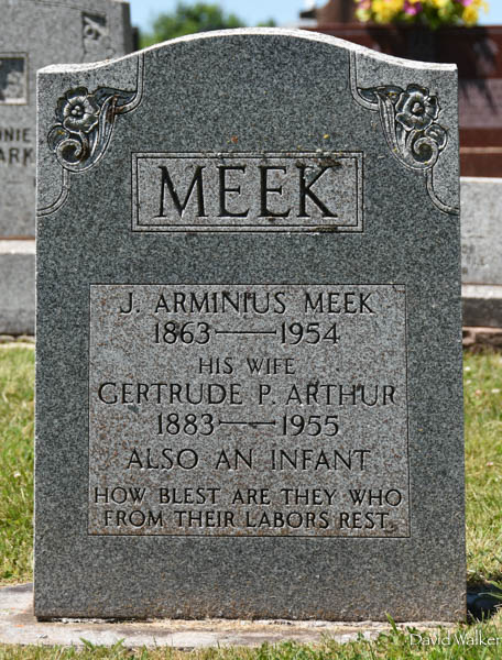 Inscription: MEEK / J. Arminius Meek / 1863 - 1954 / His Wife / Gertrude P. Arthur / 1883 - 1955 / Also an infant / How blest are they who / From their labors rest.4,3  Tombstone, J. Arminius Meek (1863-1954), his wife Gertrude P. Arthur (1883-1955). St. Thomas Anglican Cemetery, Springbrook, Queens County, Prince Edward Island, Canada.