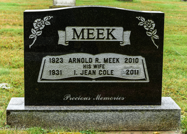 Inscription: MEEK / 1923 Arnold R. Meek 2010 / His Wife / 1931 I. Jean Cole 2011 / Precious Memories.1,3  Tombstone, Arnold R. Meek (1923-2010), his wife I. Jean Cole (1931-2011). St. Thomas Anglican Cemetery, Springbrook, Queens County, Prince Edward Island, Canada.