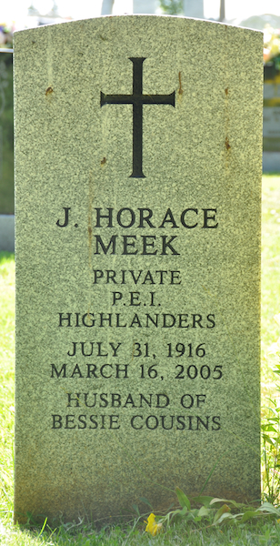 | Burial | He was buried in St. Thomas Anglican Church Cemetery, Springbrook, Queens County, Prince Edward Island, Canada, 46.49883, -63.50628G. Inscription: J. Horace / Meek / Private / P.E.I. / Highlanders / July 31, 1916 / March 16, 2005 / Husband of / Bessie Cousins.4,3 Tombstone, James Horace Meek (1916-2005). St. Thomas Anglican Church Cemetery, Springbrook, Queens County, Prince Edward Island, Canada. |