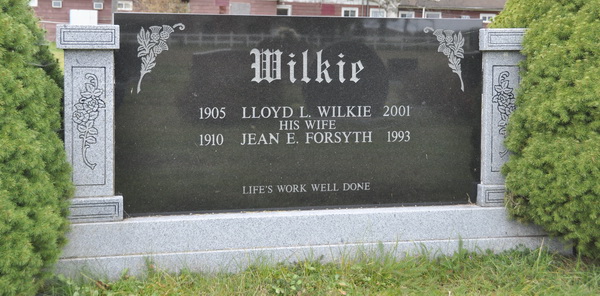 | Burial | He was buried in Hillcrest Cemetery, Alberton, Prince County, Prince Edward Island, Canada, 46.81006, -64.07772G. Inscription: WILKIE / 1905 Lloyd L. Wilkie 2001 / His Wife / 1910 Jean E. Forsyth 1993 / Life's work well doneBack: WILKIE.2 Tombstone, Lloyd L. Wilkie (1905-2001), his wife Jean E. Forsyth (1910-1993). Hillcrest Cemetery, Alberton, Prince County, Prince Edward Island, Canada. |