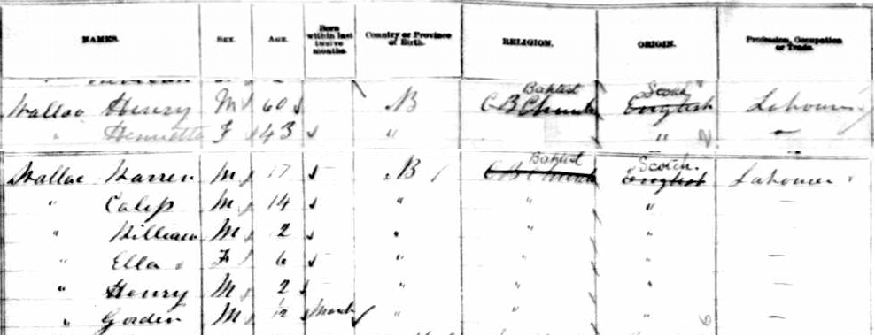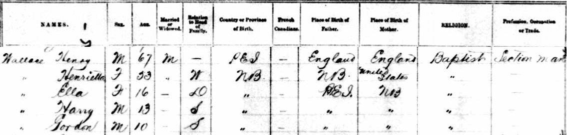 | Witness | He was enumerated on the census in April 1881 in the household of Henry Wallace in Moncton, Westmorland County, New Brunswick, CanadaG. Included in the household with Henry (age 60) was his wife Henrietta (age 43), and their children Warren (age 17), Caleb (age 14), William (age 12), Ella (age 6), Henry (age 2) and Gorden (age 1 month). Henry was a labourer. The family religion was Baptist.1 1881 Canada Census, Moncton, Westmorland County, New Brunswick. Household of Henry & Henrietta (Price) Wallace, and their 6 children. |