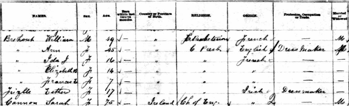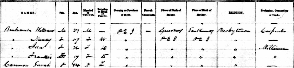 | Witness | She was enumerated on the census in 1881 in the household of William Brehaut in Summerside, Prince County, Prince Edward Island, CanadaG. included in the household with William (age 49) were his wife Nancy/Ann Cannon (age 45), their children Ida (age 16), Elizabeth (age 14) & Frances (age 7), and Ann's mother, Sarah (Horan) Cannon (age 75). Ann and the lodger were dress makers.3 1881 Canada Census, Summerside, Prince County, Prince Edward Island. Household of William Brehaut, his wife Ann/Nancy Cannon, their children Ida, Elizabeth & Frances, Ann's mother Sarah (Horan) Cannon, and an unrelated lodger. |