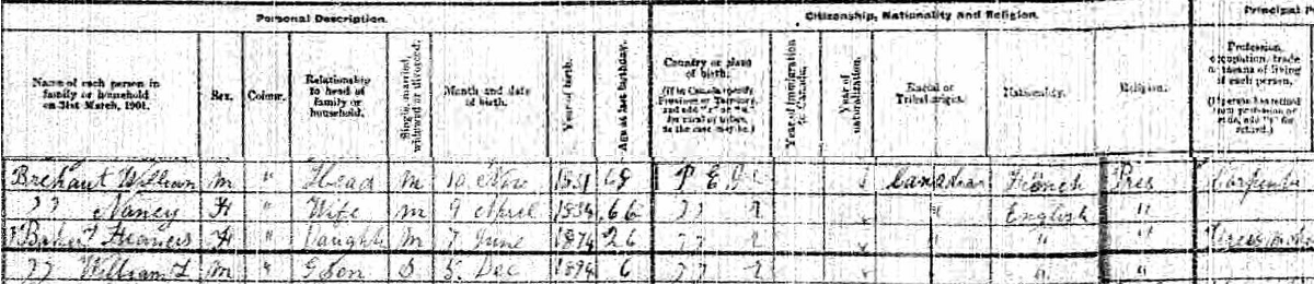 | Witness | She was enumerated on the census in 1901 in the household of William Brehaut in Summerside, Prince County, Prince Edward Island, CanadaG. included in the household with William (age 69) were his wife Nancy Cannon (age 66), their daughter Frances (age 26) and her son William (age 6).7 1901 Canada Census, Summerside, Prince County, Prince Edward Island. Household of William Brehaut, his wife Nancy Cannon, their daughter Frances, and her son William Brehaut. |