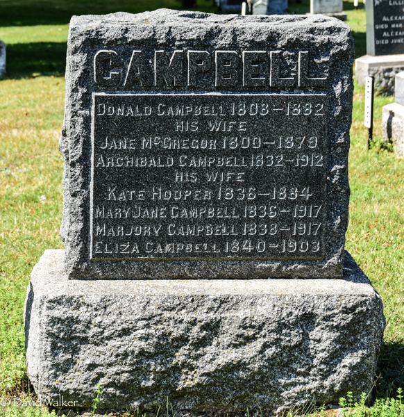Inscription: CAMPBELL / Donald Campbell 1808 - 1882 / His Wife / Jane McGregor 1800 - 1879 / Archibald Campbell (1832 - 1912 / His Wife / Kate Hooper 1836 - 1884 / Mary Jane Campbell 1836 - 1917 / Marjory Campbell 1838 - 1917 / Eliza Campbell 1840 - 1903.2  Tombstone, Donald Campbell (1808-1882), his wife Jane McGregor (1800-1879), their children Mary Jane Campbell (1836-1917), Marjory Campbell (1838-1917), Eliza Campbell (1840-1903) and Archibald (1832-1912), his wife Catherine 'Kate' Hooper (1836-1884). Central Lot 16 United Church Cemetery, Prince County, Prince Edward Island, Canada.