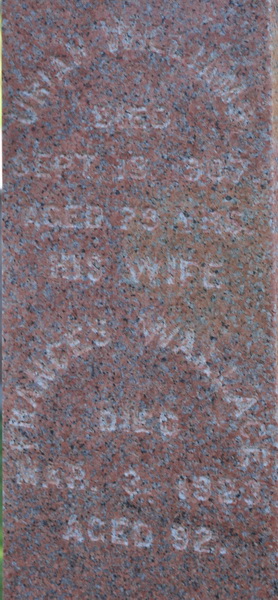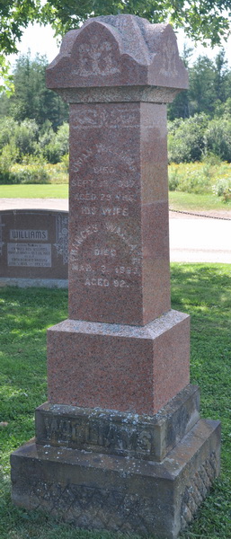 square red granite obelisk. Inscription: Uriah Williams / Died / Sept. 13, 1907 / Aged 79 yrs. / His Wife / Frances Wallace / Died / Mar. 3, 1923 / Aged 92. / WILLIAMS.2  Tombstone, Uriah Williams (1828-1907) and his wife Frances Wallace (1831-1923), St. John's Anglican Church Cemetery, Ellerslie, Prince County, Prince Edward Island, Canada.  Inscription detail.