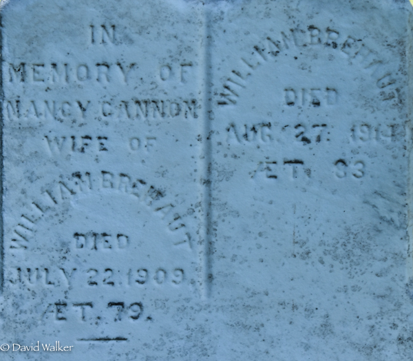 | Burial | She was buried in the Peoples Cemetery, Summerside, Prince County, Prince Edward Island, Canada, 46.40511, -63.77714G. Inscription: In / Memory of / Nancy Cannon / Wife of / William Brehaut / Died July 22, 1909 / ÆT. 79 | William Brehaut / Died / Aug. 27, 1914 / ÆT. 83.5,2 Tombstone, Nancy Cannon (1831-1909), her husband William Brehaut (1831-1914). Peoples Cemetery, Summerside, Prince County, Prince Edward Island, Canada.  Front inscription detail. |