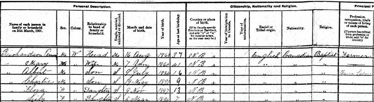 | Witness | He was enumerated on the census on 2 April 1901 in the household of Ammi Richardson in Sackville, Westmorland County, New Brunswick, CanadaG. living in the household with Ammi (age 37) were his wife Mary Wheaton (age 41), children Albert (age 16), Charlie (age 9), Flora (age 13) and Lily (age 7). Ammi was a farmer, Albert a farm labourer. The family religion was Baptist.1 1901 Canada Census, Sackville, Westmorland County, New Brunswick. Household of Ammi Richardson, his wife Mary Wheaton, their children Albert, Charlie, Flora and Lily. |