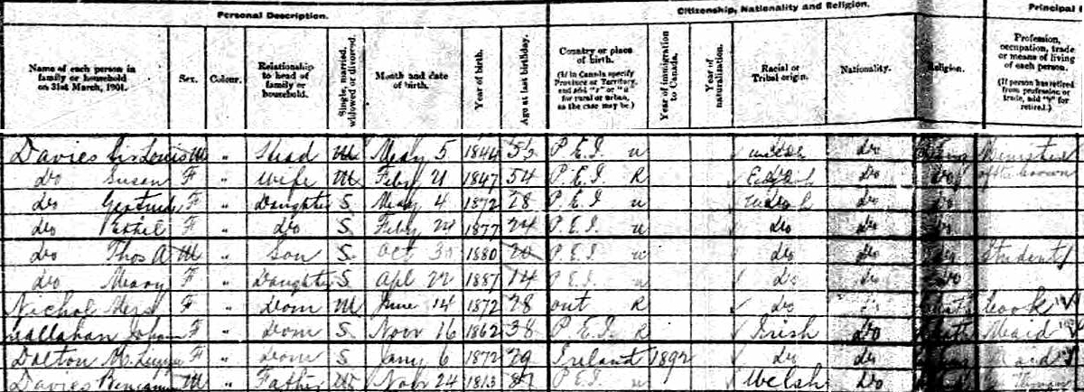 | Witness | He was enumerated on the census on 23 April 1901 in the household of Rt. Hon. Sir Louis Henry Davies in Ottawa, Ontario, CanadaG. included in the household with Louis (age 56) were his wife Susan Wiggins (age 54), children Gertrude (age 28), Ethel (age 24), Thomas (age 20), Mary (age 14), Louis' father Benjamin (age 86) and three domestic servants. Louis' occupation was recorded as "Minister of the Crown". Thomas was a student. The family religion was Church of England.3 1901 Canada Census, Ottawa Centre, Ontario. Household of Sir Louis Davies, his wife Susan Wiggins, children Gertrude, Ethel, Thomas, & Mary, Louis' father Benjamin, and three domestic servants. |