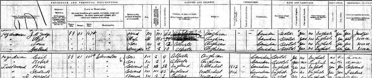 | Census | Harry Harland Hyndman was head of the household in the census on 9 June 1911 in Edmonton, Alberta, CanadaG. included in the household with Harry (age 29) are his brother Charles (age 25), mother Catherine McDonald (age 65) and Hattie Stewart, a domestic. Harry was a barrister, Charles a manager (not specified). The family religion was Presbyterian.5 |