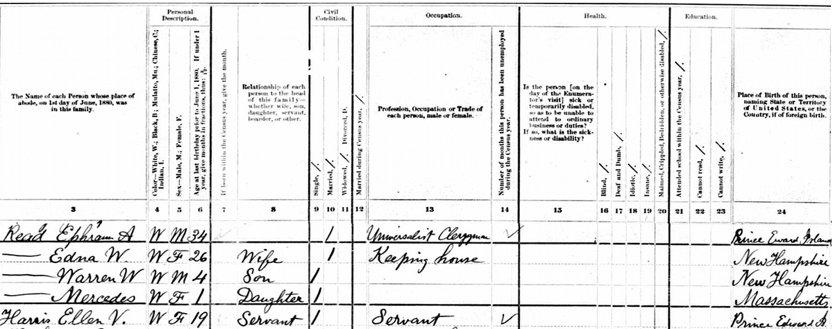 | Witness | He was enumerated on the census on 15 April 1891 in the household of Thomas Whittemore Read in Summerside, Prince County, Prince Edward Island, CanadaG. included in the household with Thomas Whittemore (age 34) were his wife Elvira Davidson (age 35) and their only surviving child, Lorne (age 3) - three children had died young. His occupation was recorded as Master Mariner (ship's captain). The family religion was Universalist.2 1891 Canada Census, Summerside, Prince County, Prince Edward Island. Household of Thomas Whittemore Read, his wife Elvira Davidson and their son Lorne. |